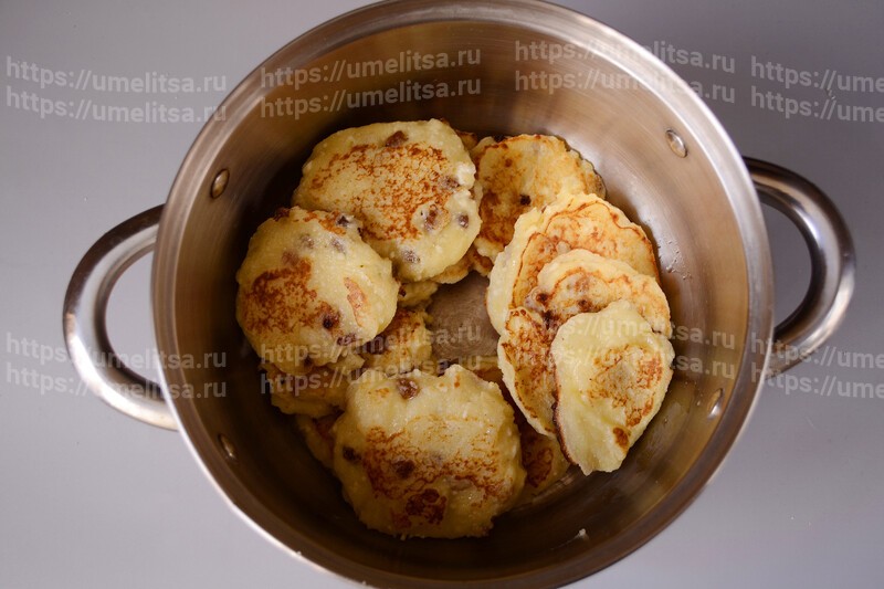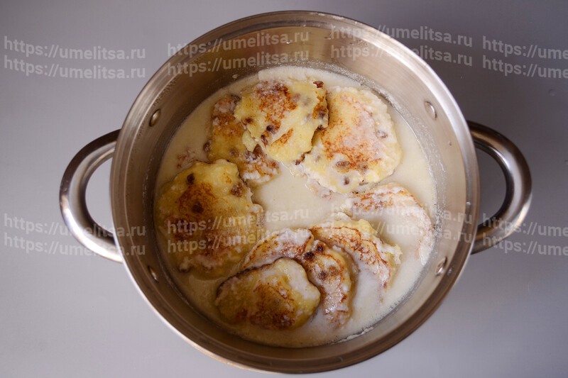Выложите обжаренные сырники в кастрюлю с толстым дном.