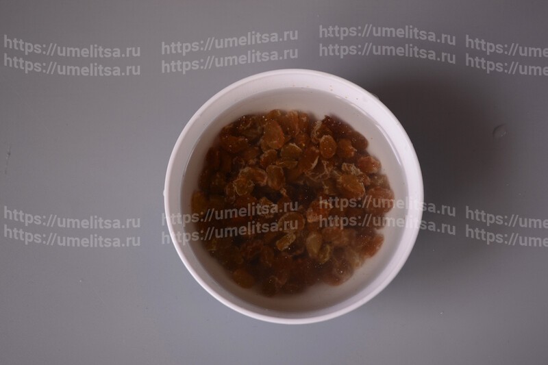 Изюм тщательно промойте и замочите в горячей кипяченой воде минут на 15. Затем еще раз промойте и выложите на бумажное полотенце.