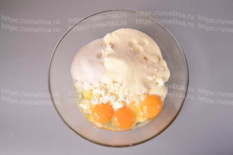 В глубокую миску выложите творог, добавьте манку, столовую ложку сахара, ванилин. Вбейте яйца.