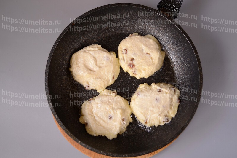 Смажьте сковороду маслом, столовой ложкой выложите тесто для сырников. Обжаривайте на среднем огне до золотистого цвета.