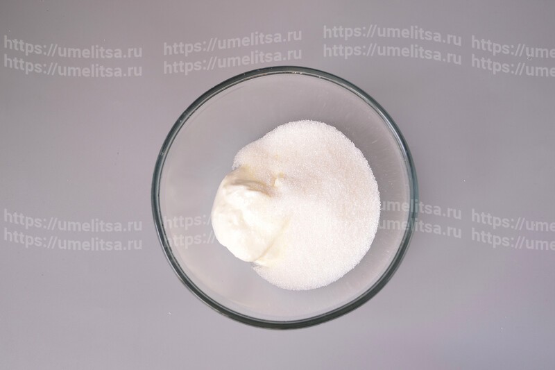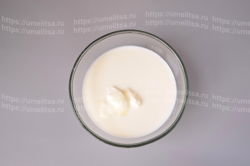 Приготовьте сметанный соус. Столовую ложку сахара смешайте со сметаной и молоком.
