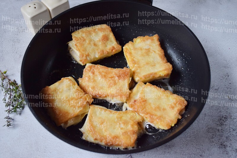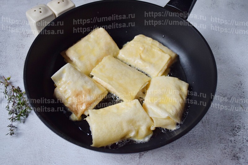 Жарьте на умеренном огне с двух сторон до тех пор, пока конвертики не приобретут золотистую корочку.