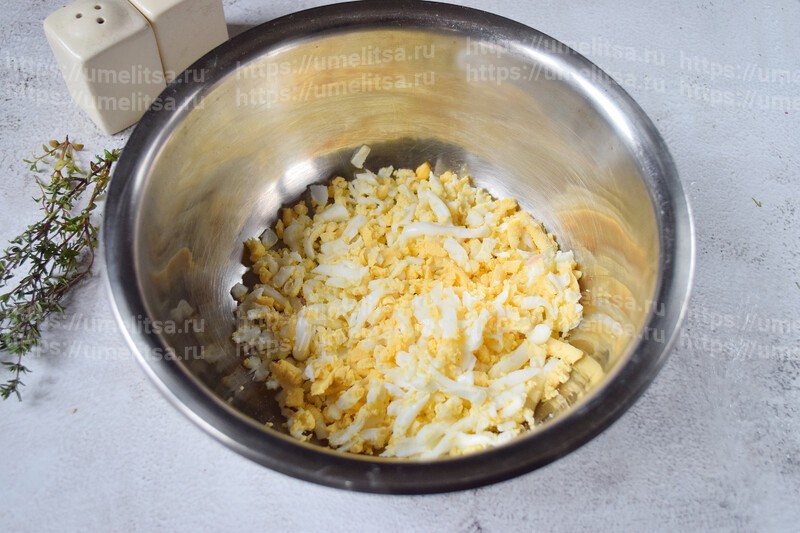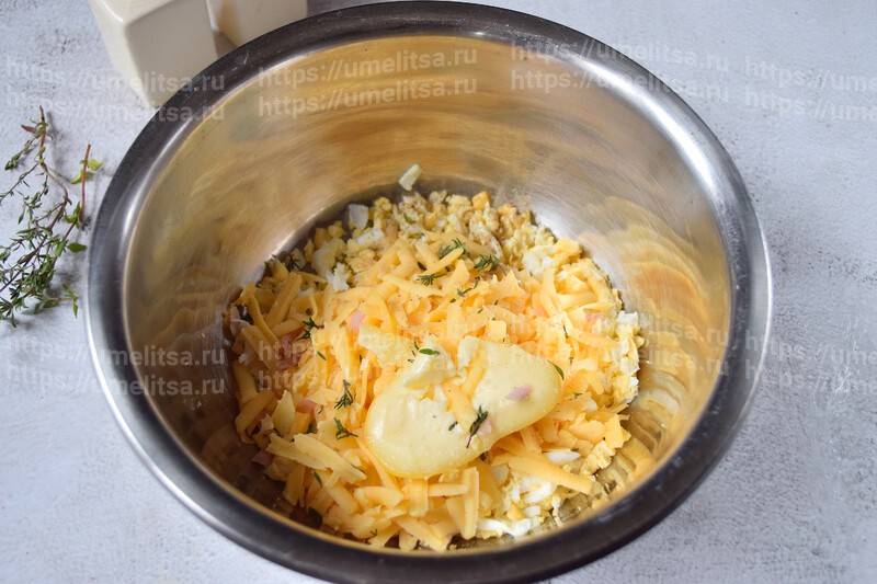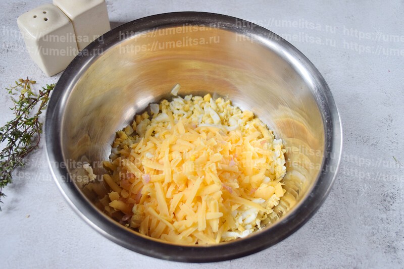 Сыр натрите на крупной тёрке в миску к яйцам. Если будете использовать плавленые сырки, сначала положите их на 15 минут в морозилку. Так натереть будет гораздо проще.