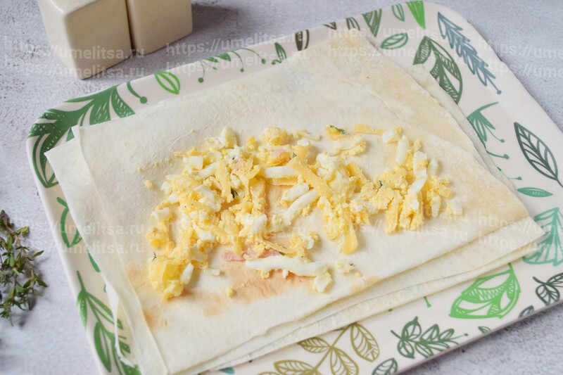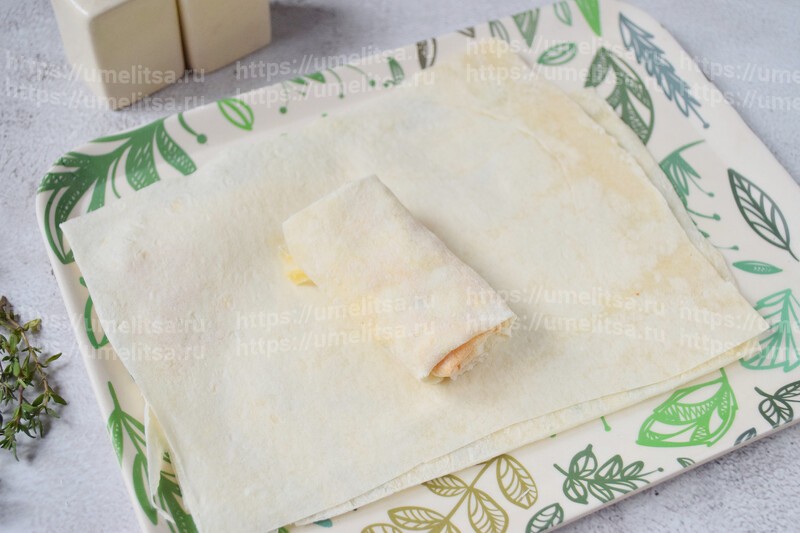 Конвертики из лаваша делайте небольшого размера. Разрежьте лаваш на 12 равных частей и выложите начинку.