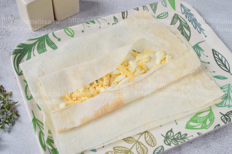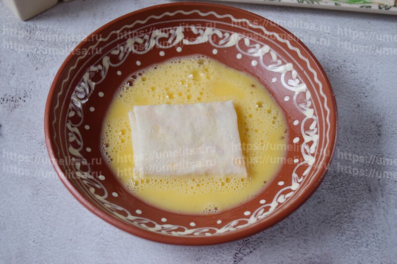 В глубокую тарелку разбейте два яйца. Посолите, поперчите, взбейте вилкой. Обмакните каждый конвертик из лаваша.