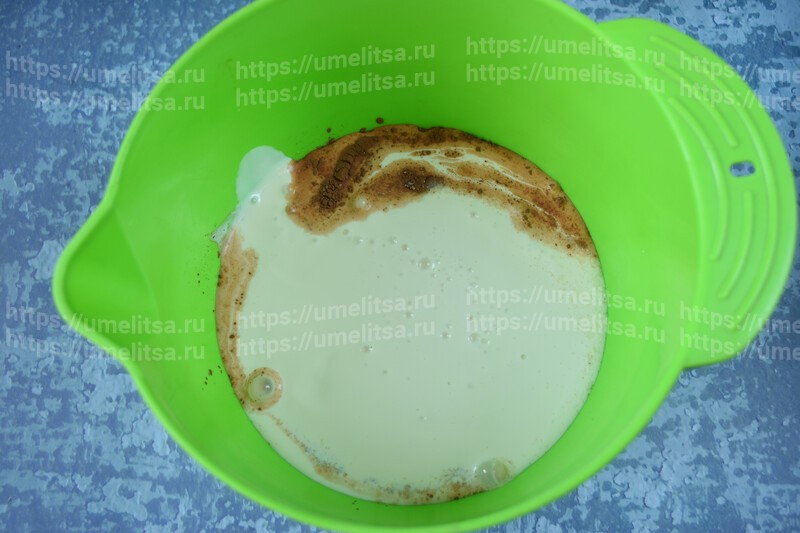 Залейте ряженкой. Желательно, чтобы она была комнатной температуры. Так сахарная пудра быстро растворится.