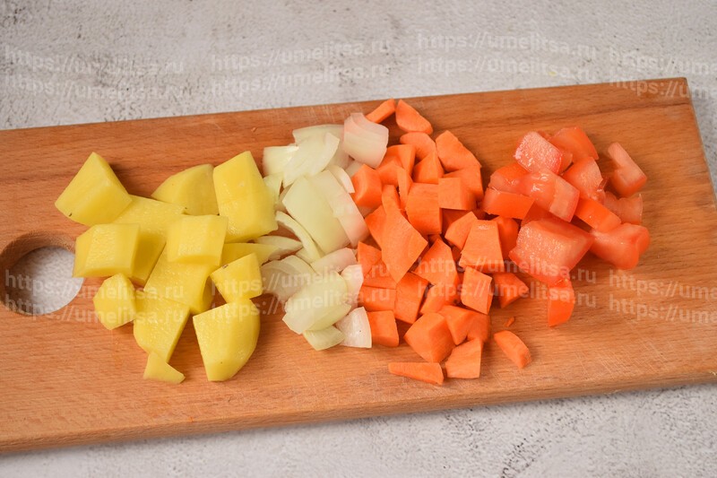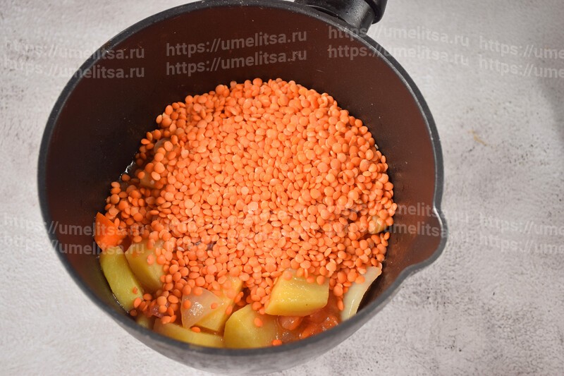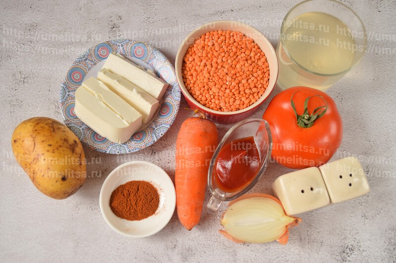Морковь и картофель очистите, нарежьте квадратиками. Лук очистите нарежьте кубиками. Нарежьте помидоры. Чечевицу промойте прохладной водой, откиньте на дуршлаг.