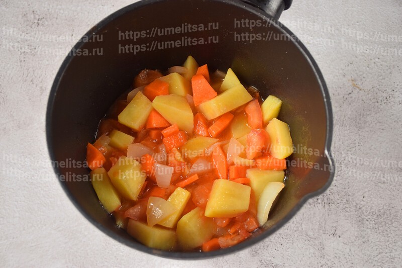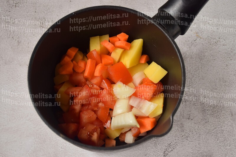 Сложите нарезанные овощи в сотейник и добавьте сливочное масло.