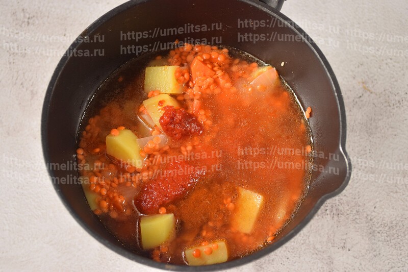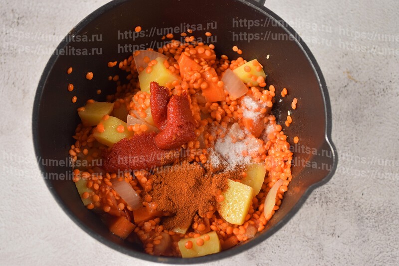 Положите томатную пасту, специи, посолите по вкусу, перемешайте.