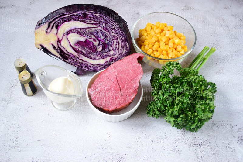 Простой и быстрый салат из краснокочанной капусты, который готовится буквально за пять минут. Можно использовать и обычную, белокочанную капусту, и пекинскую. Если вы поститесь, не добавляйте мясо. Получится превосходный постный салатик. Ингредиенты можно менять по своему усмотрению. Самый большой плюс этого салата в его простоте. Все ингредиенты, которые используются, уже готовы. Не нужно ничего варить, остужать и чистить. Продукты рассчитаны на 4 порции.