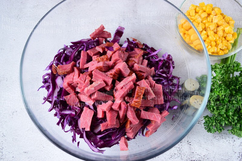 Колбасу или мясо нарежьте тонкой соломкой и выложите в салатник.