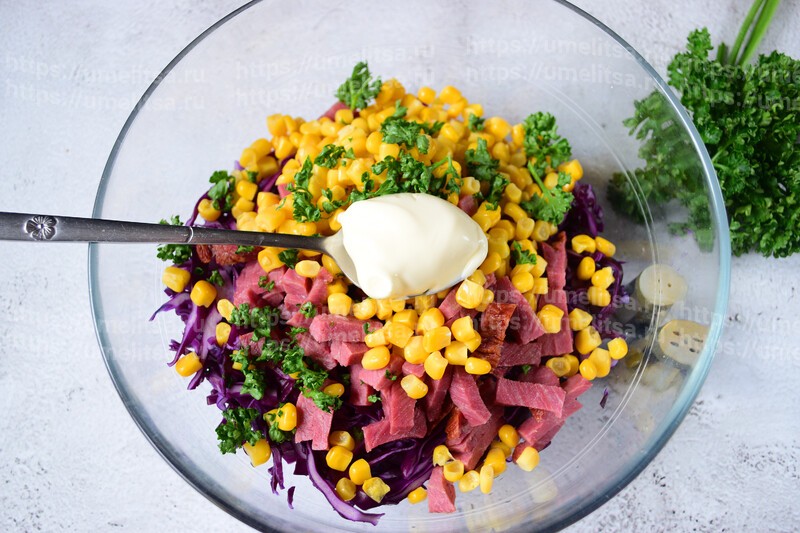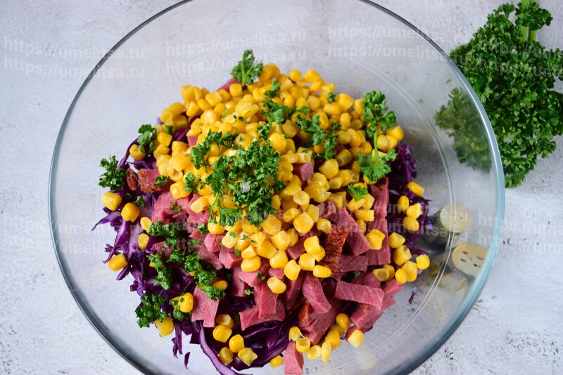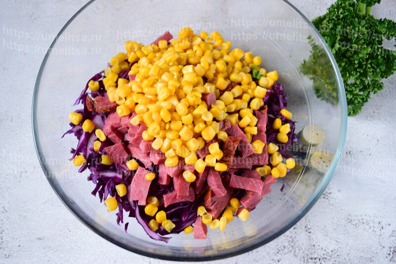 Кукурузу откиньте на дуршлаг, чтобы стёк маринад. Можно промыть кипячёной водой. добавьте в салатник следом за колбасой.