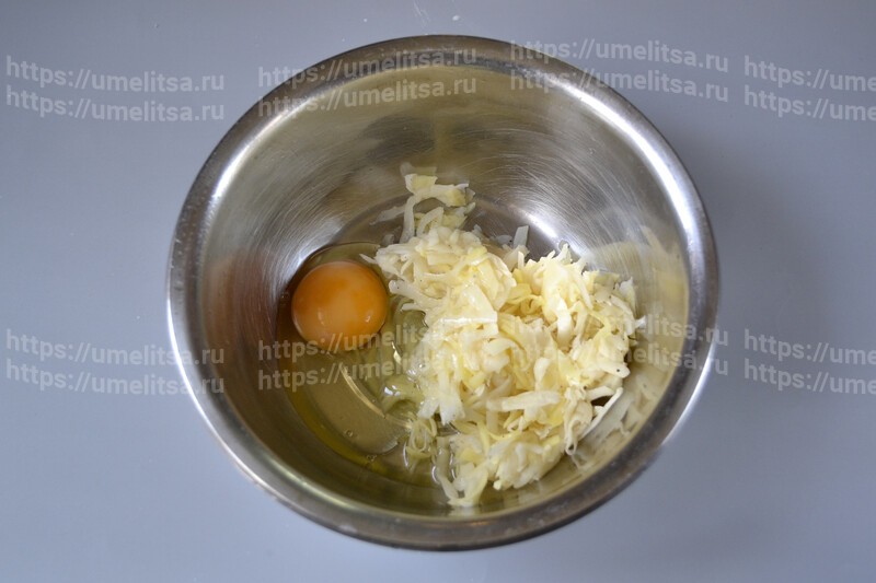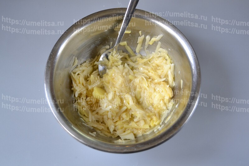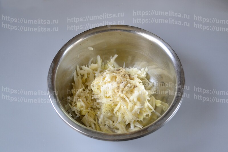 Картофель натираем на крупной терке. Немного присаливаем, перемешиваем и оставляем минут на 15 в сите. Картофель даст сок. Он нам не нужен. Отжимаем хорошо картофель и продолжаем.
