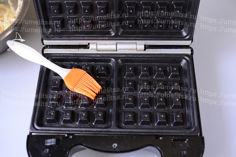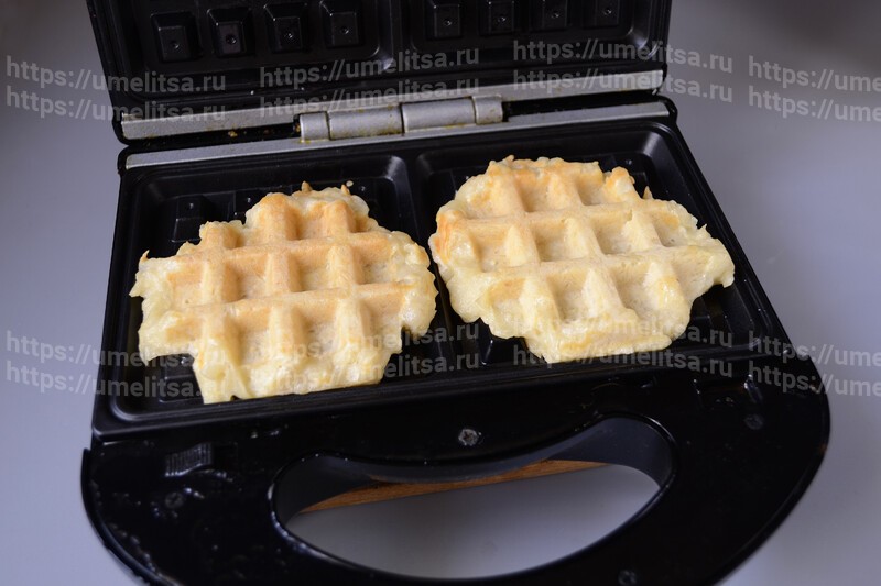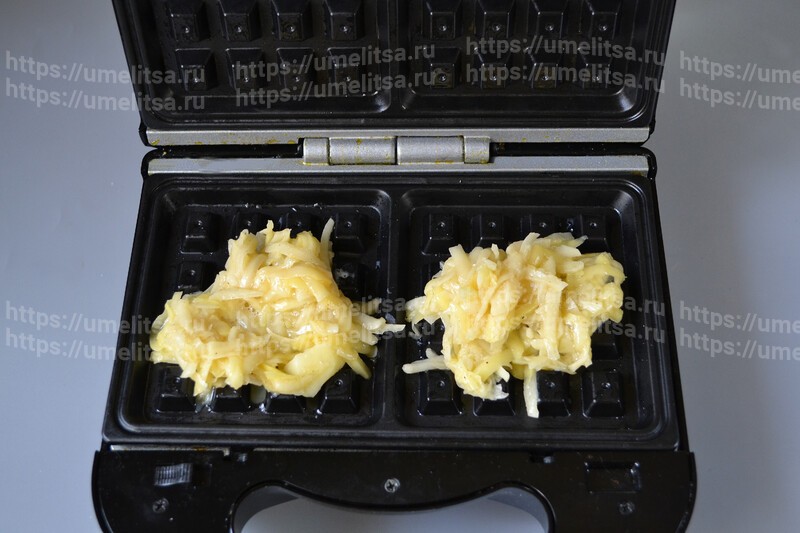 Выкладываем картофельное тесто в разогретую электровафельницу.