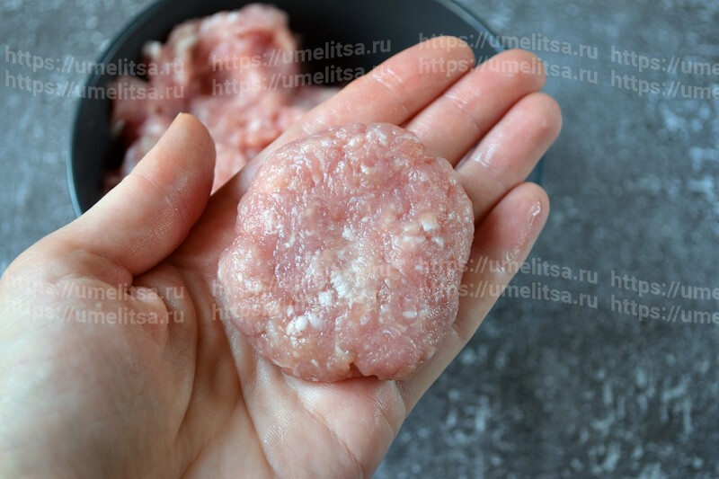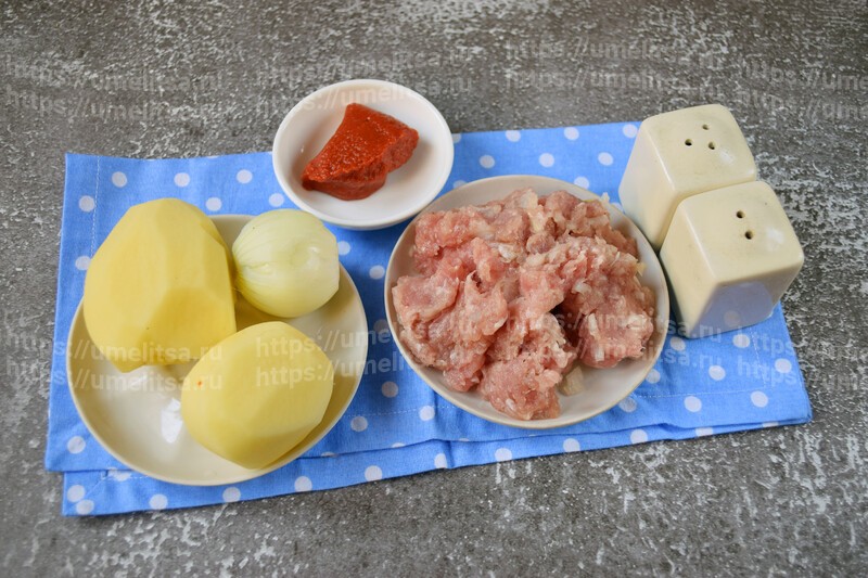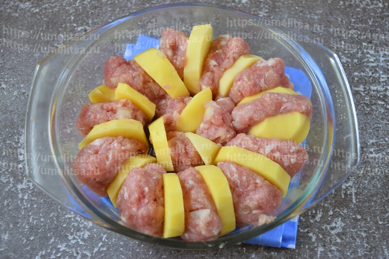 Посолите, поперчите фарш. Добавьте любимые специи. Сформируйте котлетки небольшого размера. Так как фарш с котлетами будет укладываться вертикально, сделайте размер котлеток соответственно размеру срезов от клубней картофеля.