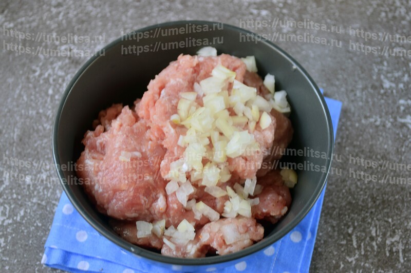 Лук очистите от шелухи и нарежьте мелкими кубиками. Не пропускайте лук через мясорубку, фарш будет жидким. Смешайте с охлаждённым фаршем. Если фарш был заморожен, размораживайте без теплового воздействия. Просто при комнатной температуре.