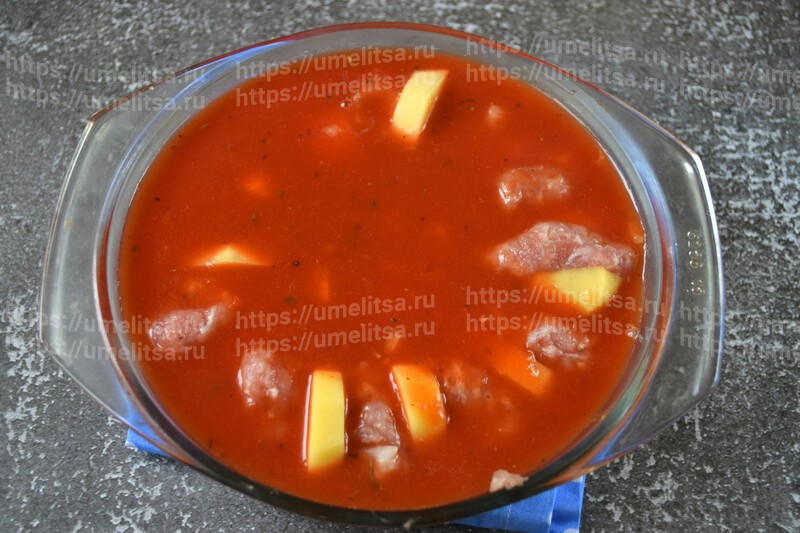 Томатную пасту разведите в 300 мл тёплой воды, добавьте по вкусу соль, перемешайте. Залейте котлеты с картофелем.