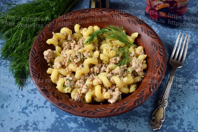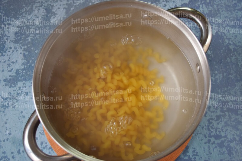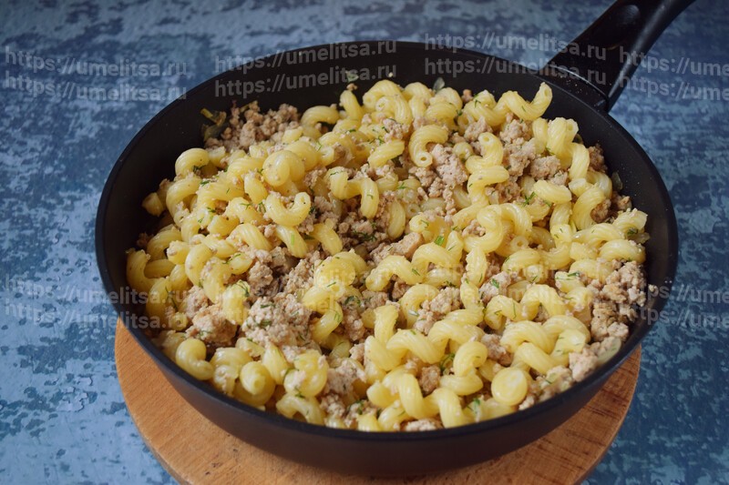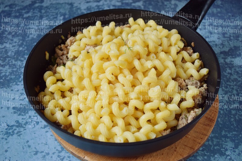 Сваренные макароны откиньте на дуршлаг, чтобы стекла вода. Выложите в сковороду и перемешайте. Макароны из твёрдых сортов пшеницы промывать холодной водой не нужно.
