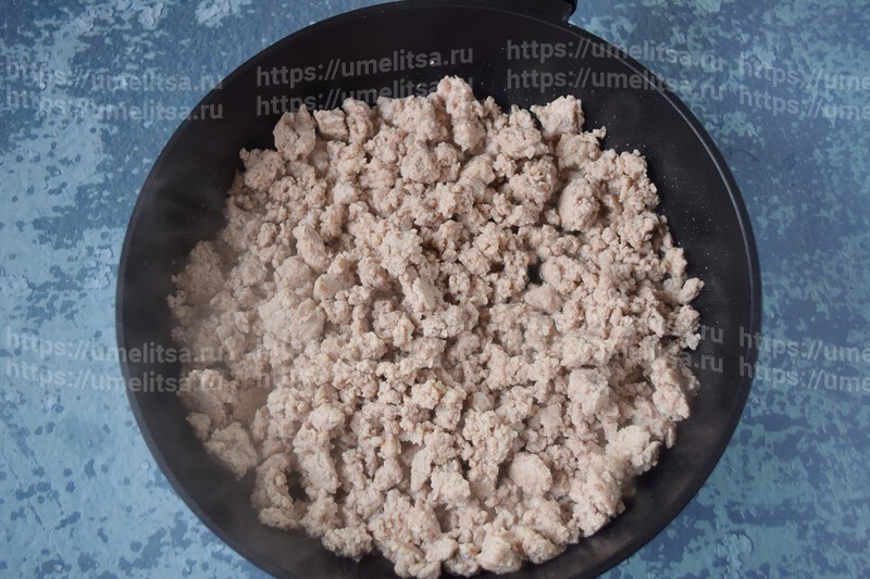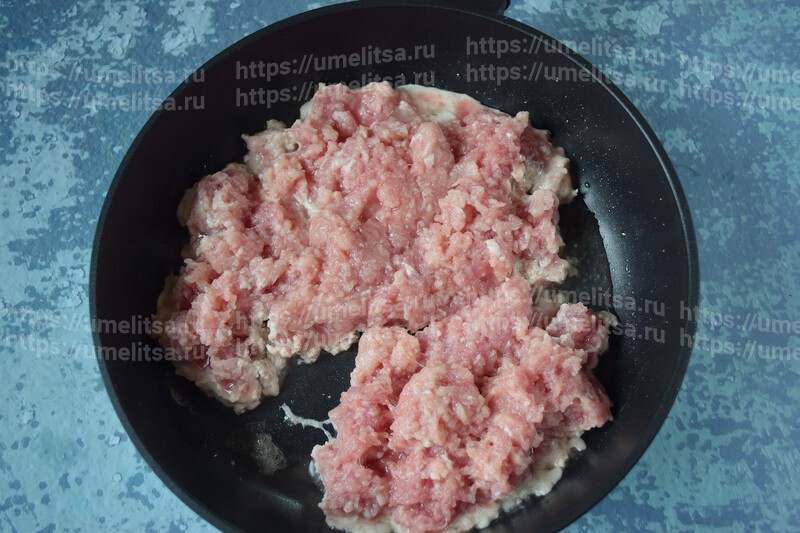 На сковороду с антипригарным покрытием выложите фарш. Если он достаточно жирный, сковороду ничем не смазывайте. Если фарш сухой, добавьте столовую ложку растительного масла.
