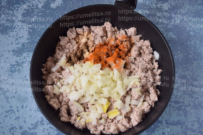 Очистите и мелко нарежьте лук. Добавьте в фарш любимые специи по вкусу и соль.