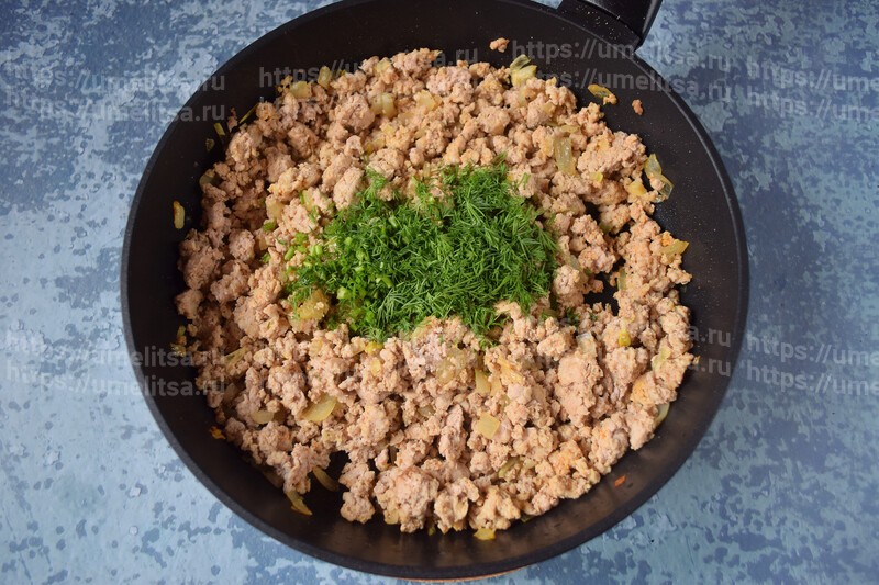 Перемешайте, жарьте ещё 3-4 минуты на среднем огне. Вымойте, обсушите и мелко нарежьте свежий укроп.