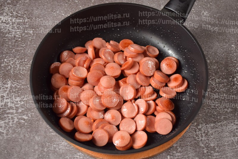 На сковороде разогрейте масло. Сосиски очистите и нарежьте кругляшками. Выложите на сковороду и жарьте, пока будете подготавливать овощи.
