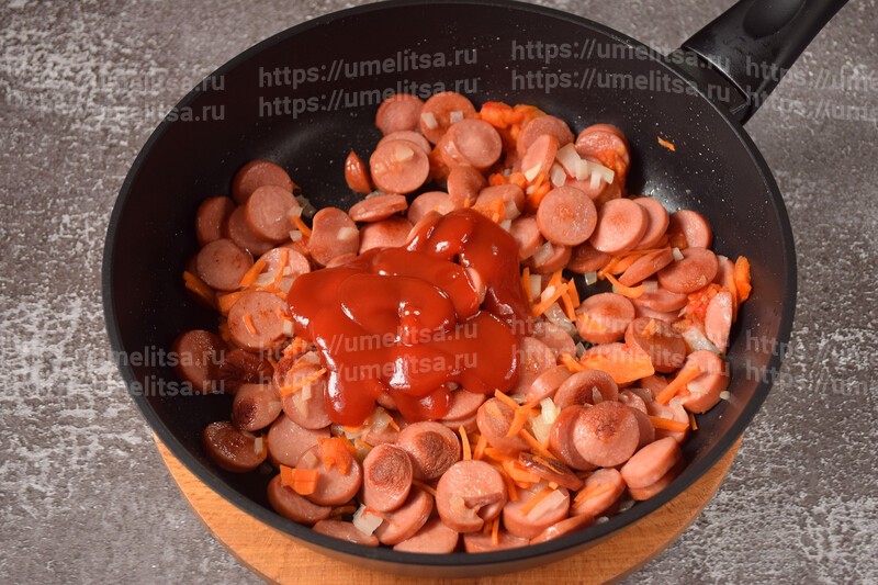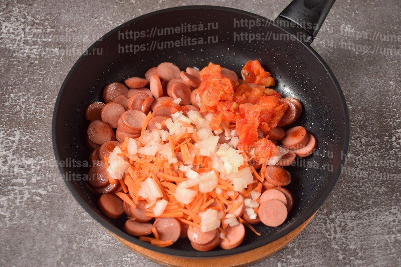 Морковь очистите от кожуры и натрите на крупной тёрке. Лук очистите от шелухи и нарежьте мелкими кубиками. Добавьте к сосискам, перемешайте. Обжаривайте ещё 5-7 минут.