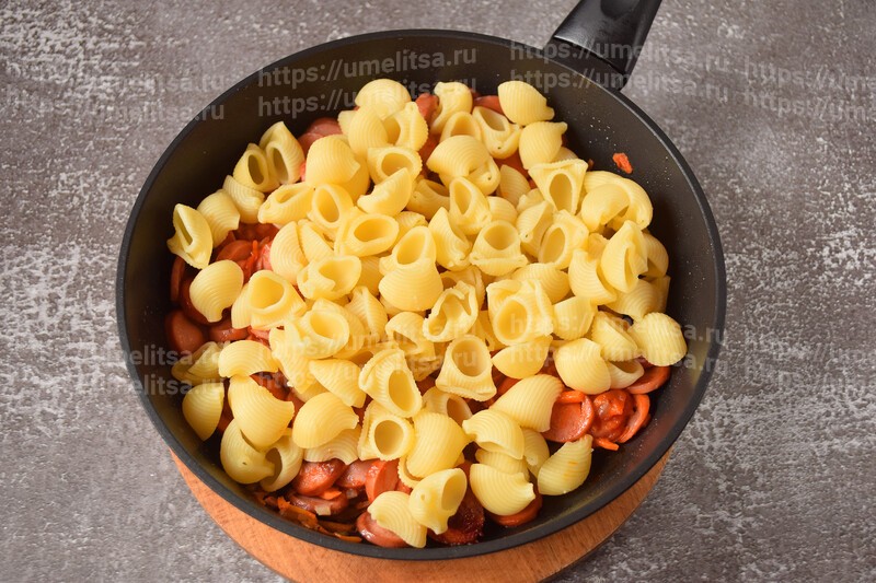 Готовые макароны откиньте на дуршлаг. Макароны из твёрдых сортов промывать водой не нужно. Выложите макароны в сковороду и перемешайте.