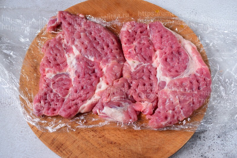 Промойте мясо в холодной воде, обсушите на бумажном полотенце. Положите на разделочную доску пищевую плёнку, на неё уложите кусочки мяса около 2 сантиметров толщиной, разрезанные поперёк волокон. Второй частью пищевой плёнки накройте мясо, отбейте кухонным молоточком. Пищевая плёнка необходима для того, чтобы по всей кухне не было брызг. Посыпьте отбивные солью, оставьте на пару минут, а пока подготовьте остальные ингредиенты.