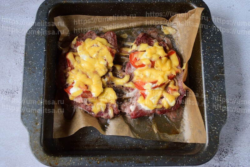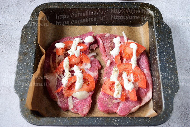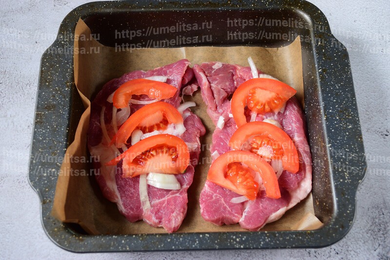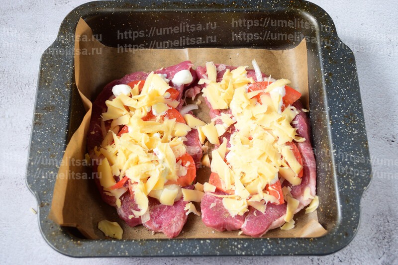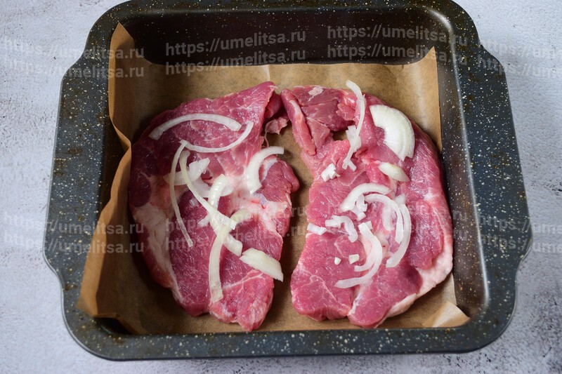 Лук очистите и нарежьте полукольцами. Форму для выпечки застелите пергаментом и положите отбитое мясо. Посыпьте нарезанным луком.