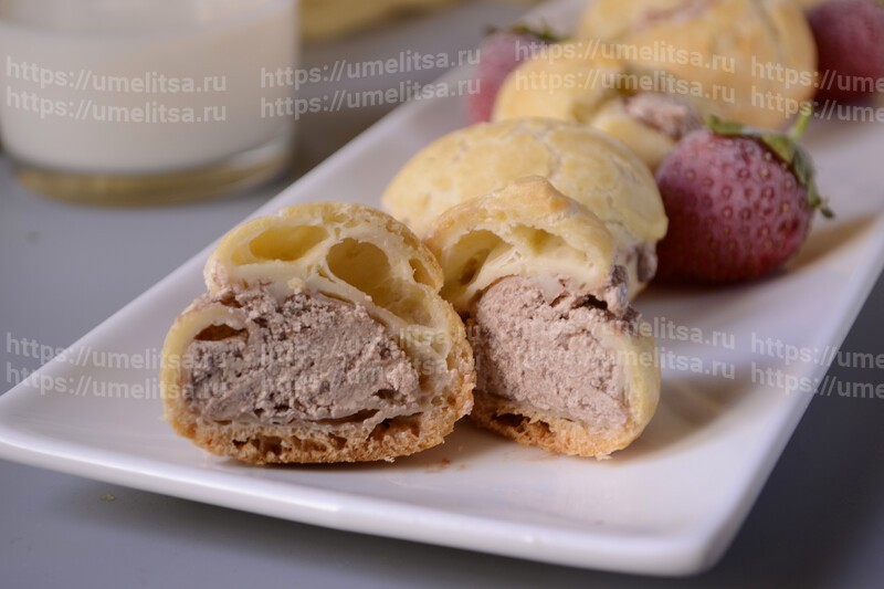 Чтобы эклеры получились действительно вкусными, подойдите ответственно к выбору ингредиентов. В тесто лучше добавить сливочный маргарин, а вот в крем обязательно настоящее сливочное масло без добавок растительных жиров. То же касается и сгущенного молока. В составе настоящей сгущёнки не должно быть ничего кроме молока и сахара. Вообще, крем для эклеров может быть любым: сливочным, заварным, шоколадным.
