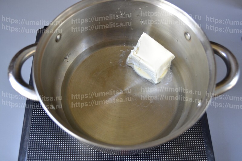 В кастрюлю с толстым дном налейте воду, добавьте соль и выложите маргарин. Доведите воду до кипения на среднем огне и убавьте газ на минимум.