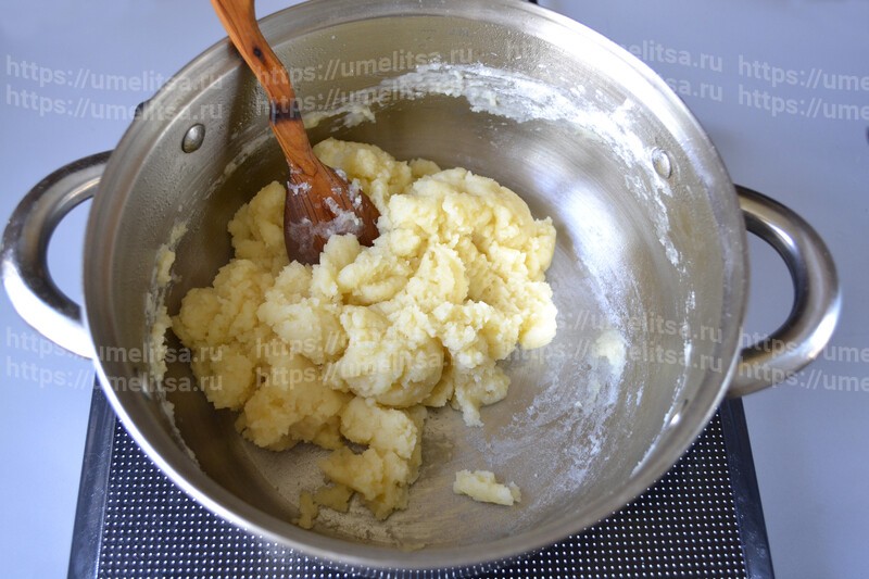 Верните кастрюлю на огонь и вымесите тесто ложкой, чтобы не было комков. Заваривайте тесто, постоянно помешивая, в течение 3 минут.