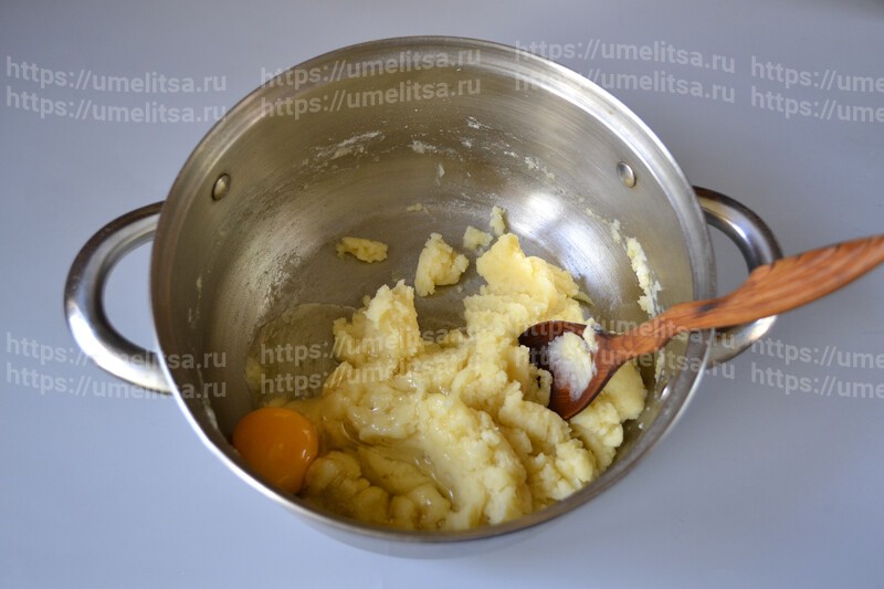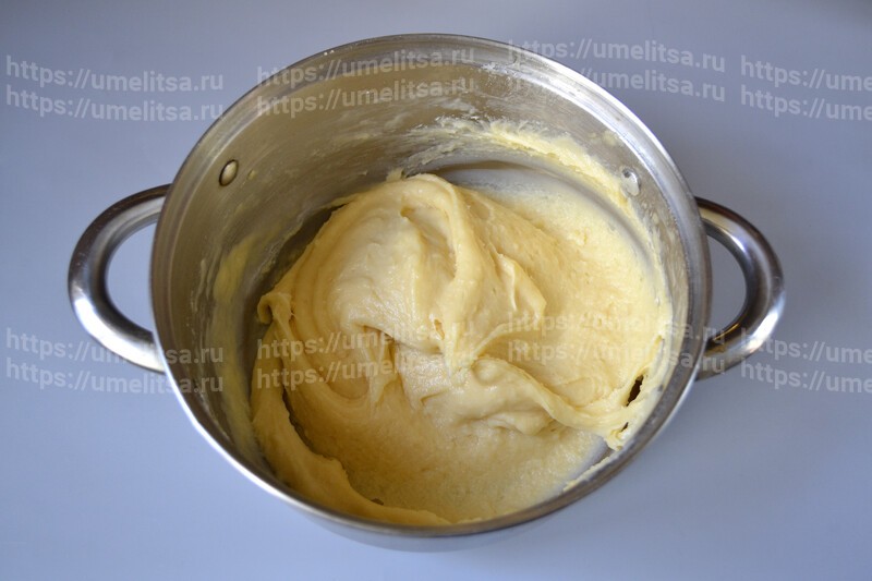 Уберите кастрюлю с огня и остудите тесто до комнатной температуры. Вбейте одной яйцо. Тщательно размешайте. Затем также по одному добавьте остальные яйца.