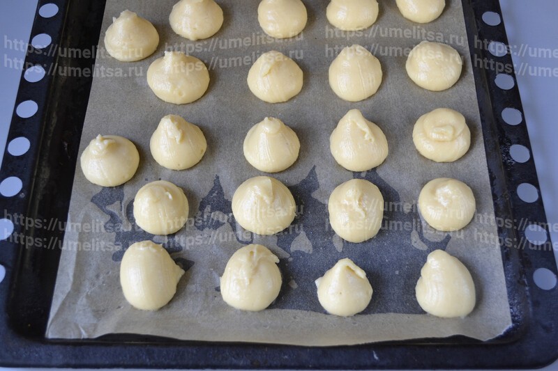 Застелите противень пергаментом и смажьте растительным маслом при помощи силиконовой кисточки. Выложите тесто на противень десертной ложкой, либо из кондитерского мешка. Оставьте небольшое расстояние с учетом того, что тесто увеличится в объёме.