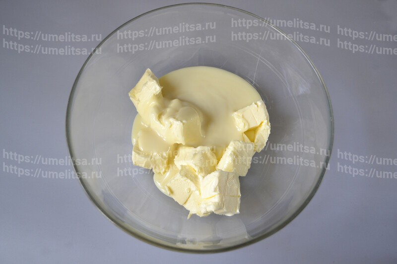 В миску для взбивания выложите размягченное сливочное масло, нарезанное кубиками, и вылейте сгущёнку. Взбейте крем миксером.