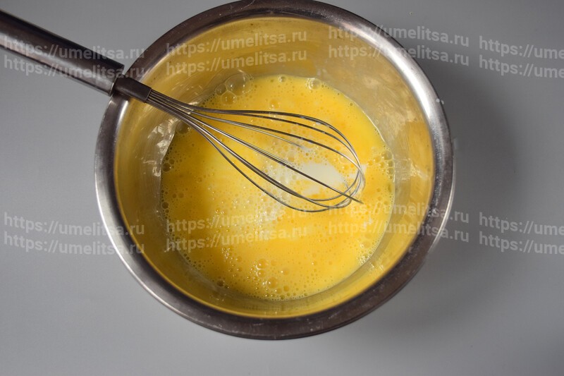 Разбейте в глубокую миску яйца и оставьте минут на 10. Этого времени будет достаточно, чтобы они нагрелись. Молоко подогрейте до 50 градусов. Добавьте к яйцам и перемешайте венчиком.