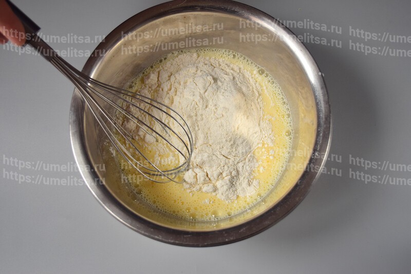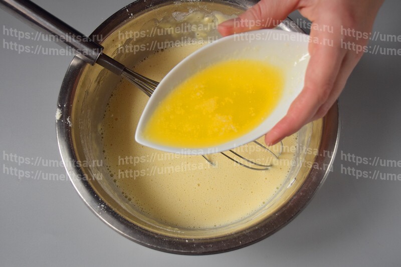 Растопите сливочное масло на медленном огне или в микроволновке. Добавьте тонкой струйкой в тесто, постоянно перемешивая его венчиком.