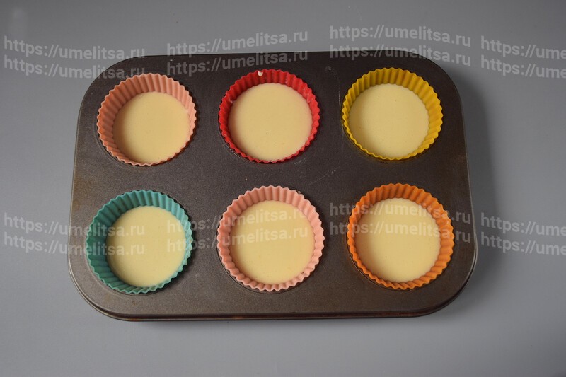 Установите в противень силиконовые формочки для выпечки мини-кексов. Можете смазать их капелькой растительного масла. Но это необязательно. Обязательно смазывать только железные формы. Заполните формы тестом до половины.
