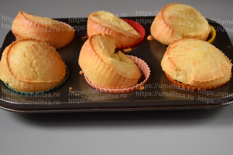 Ни в коем случае во время приготовления булочек не открывайте духовку! И соблюдайте температурный режим, иначе булочки будут румяные снаружи, но сырые внутри. Когда булочки будут готовы, сразу же достаньте их из духовки и выньте из форм. Они сами выпрыгнут. Сделайте острым тонким ножом горизонтальный надрез. Если всё было сделано правильно, булочки внутри получаются пустыми.