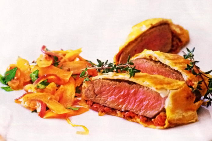"Конвертики" из слоеного теста с бараниной в томатах